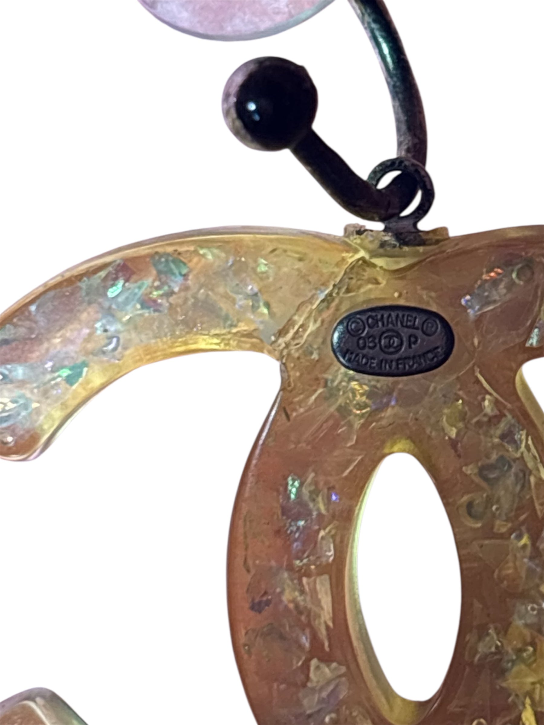 From Spring 2006, these fun earrings are made of a transparent resin material with glitter specks throughout. They are dangle style, and features the iconic Coco Mark (double C) design. One earring was once damaged but has been fully repaired, please see photo.