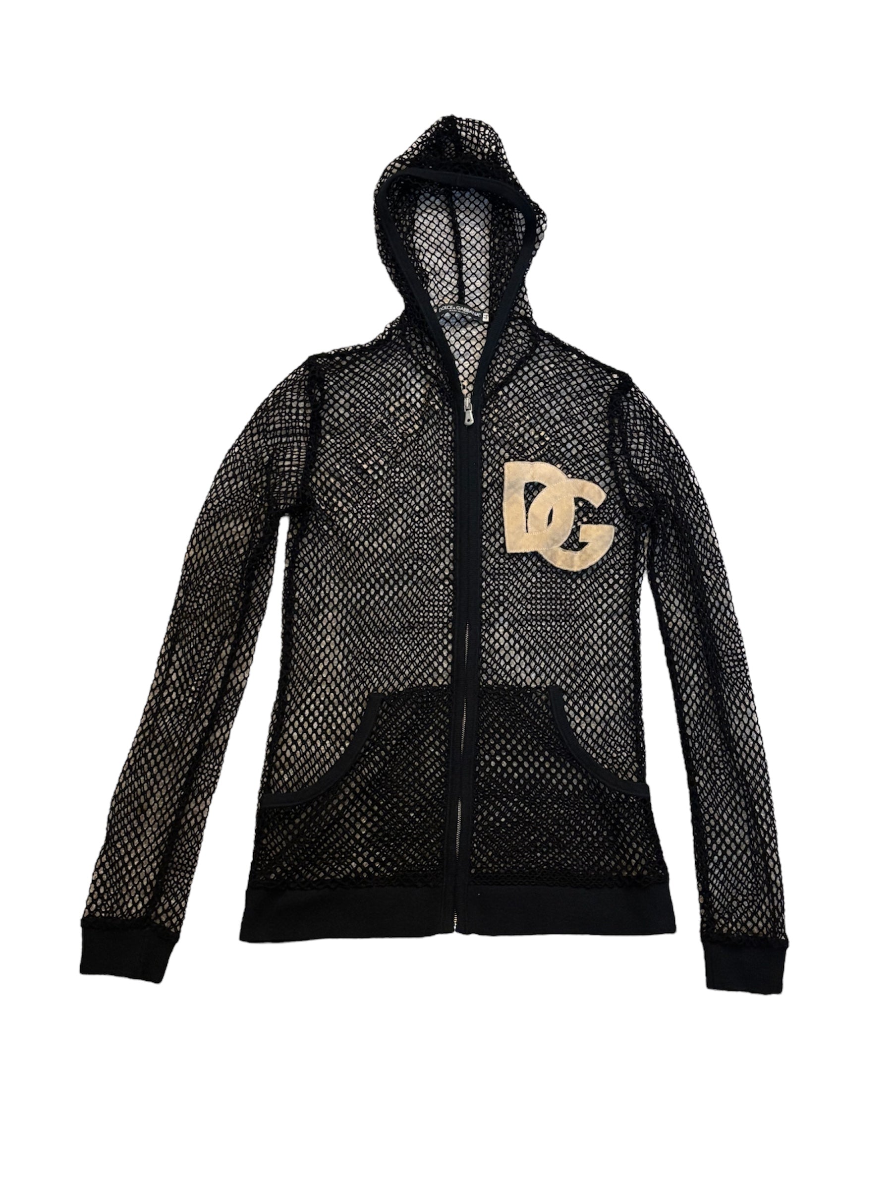 This fully fishnet zip-up hoodie features the iconic “D&G” on the front, followed by the brand name on the back in gold. Perfect as a swimsuit cover, and can be styled to be worn casually. Perfect condition.
