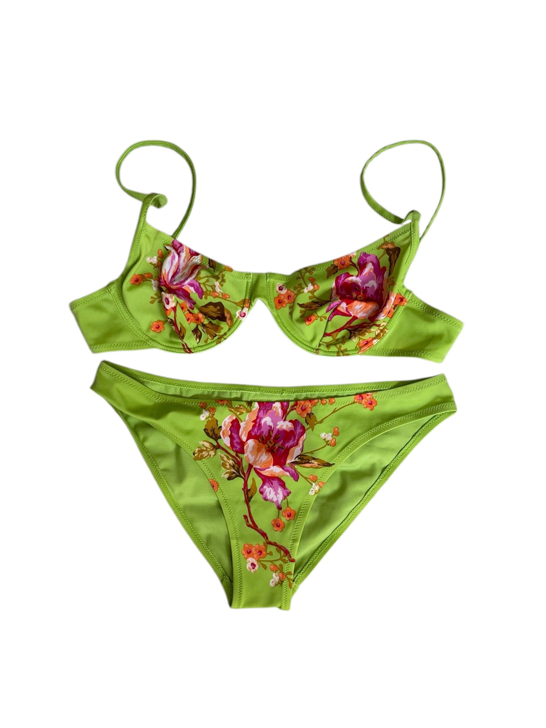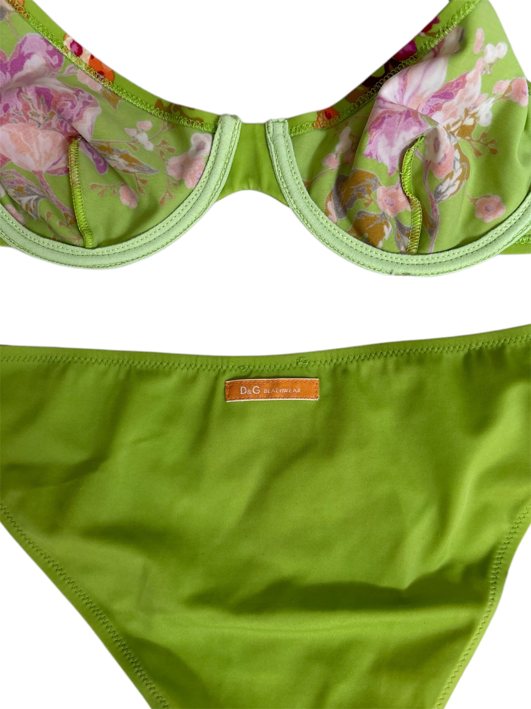 Vintage D&G by Dolce&Gabbana bikini set. Gorgeous green color with floral designs throughout, and subtle logo showing on the back. The original size tag has been cut out.